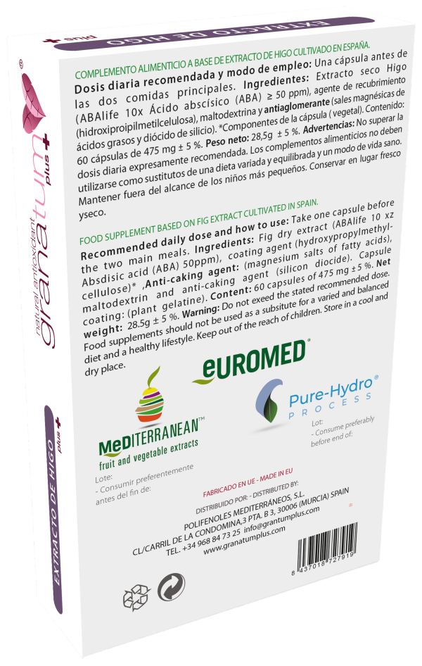 Extracto de Higo Plus es un complemento alimenticio elaborado a partir de extracto seco de higo (Ficus carica L.) cultivado en España y estandarizado en ácido abscísico (ABA), una fitohormona natural con un papel clave en la regulación del metabolismo de la glucosa.